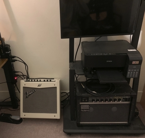 面對桌子的右手邊,放了電視、印表機、2 顆吉他音箱,這些東西,就都直接進入直通插座,沒有進入濾波器了,因爲電視、印表機不需要濾雜訊,而吉他音箱屬於後級大功率設備,理論上也是不進濾波器比較好。