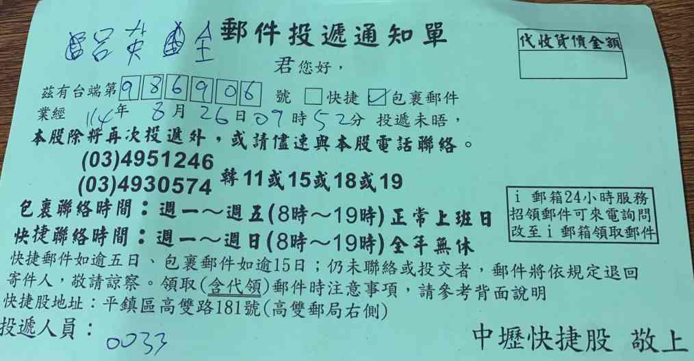 中午出門買飯就看到信箱有「郵件投遞通知單」。