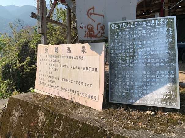 停車場對面就會看到新興溫泉的告示牌,新興溫泉跟嘎啦賀是同音異名同樣的溫泉,只是名字不一樣。