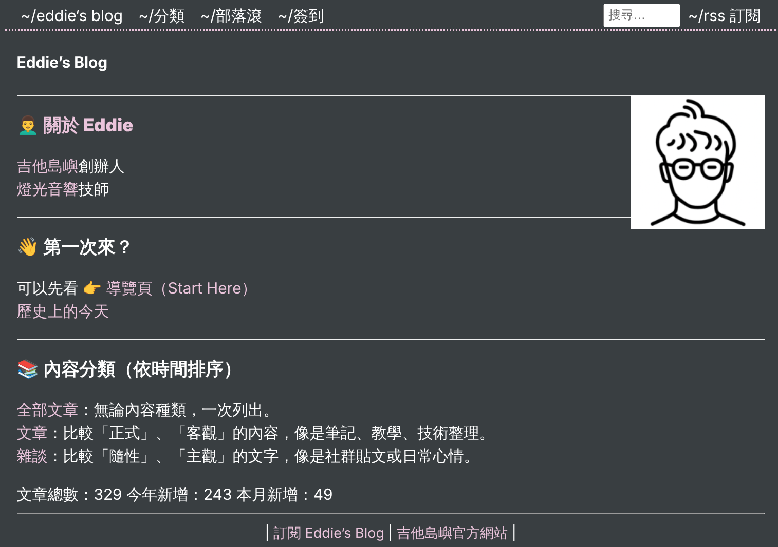 ~/Eddie's Blog ~/分類 ~/誰來我家 ~/部落滾 ~/🎲隨機 ~/📅歷史 ~/RSS