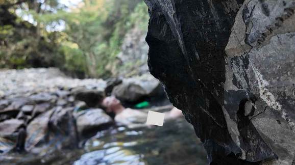 可以透過調整石頭,來調整溫泉熱水與河川冷水的比例,但 Eddie 喬了很久都沒有滿意。最後發現一個地方看起來很好躺,沒想到那裡就是溫度最剛好的地方!